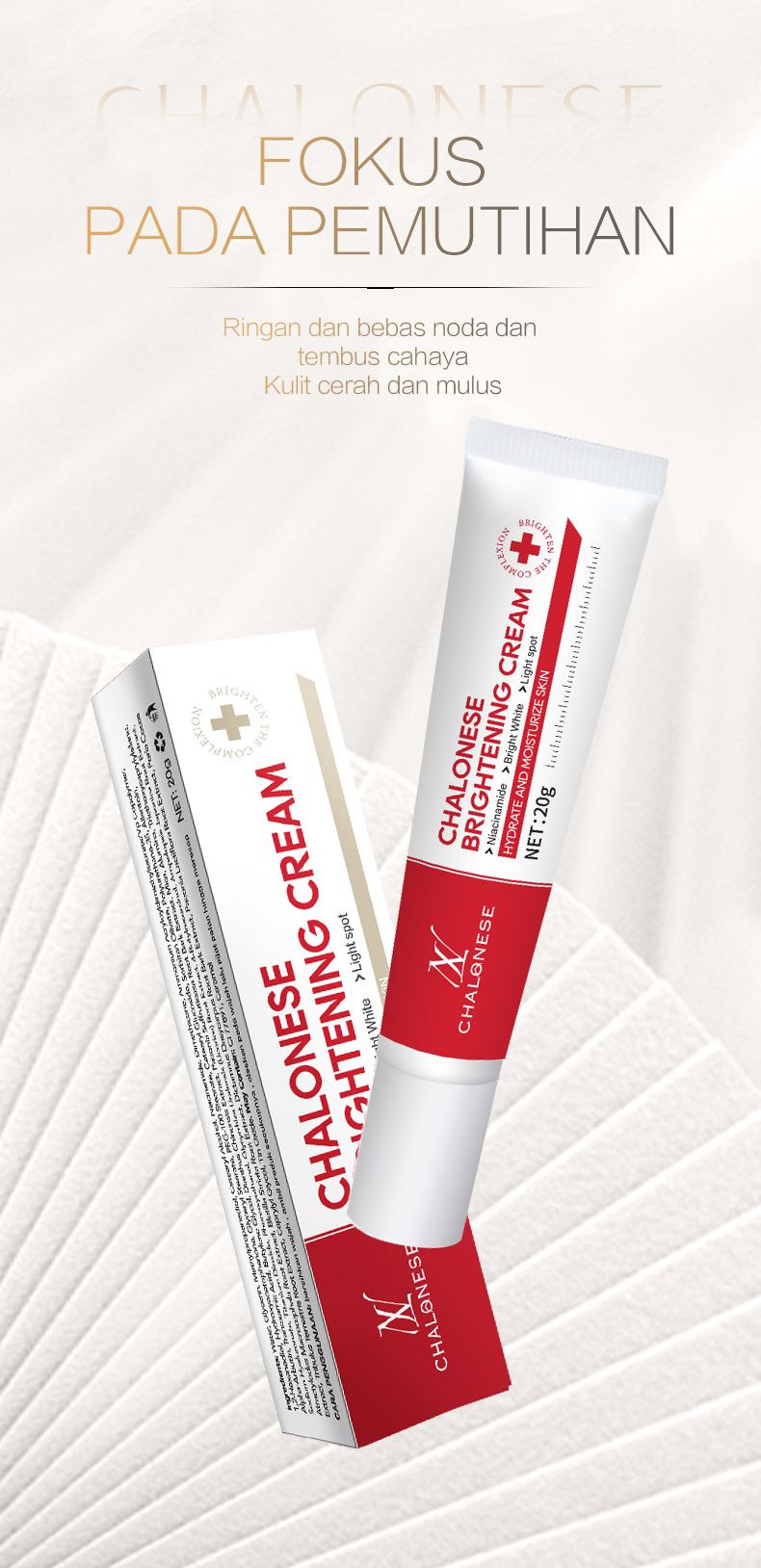 Brightening Cream in Chalonese Use Chalonese Brightening Cream to bring out the natural radiance of your skin. This cream is specifically designed to lighten dark spots, balance out skin tone, and lessen pigmentation using cutting-edge whitening chemicals and nourishing nutrients. Its non-greasy, light composition absorbs rapidly, leaving your skin feeling rejuvenated, silky, and glowing.