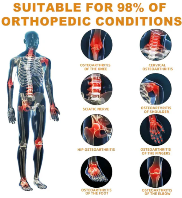 It can alleviate and treat osteoarthritis, rheumatoid arthritis, bursitis, tendinitis, osteoporosis, gout, carpal tunnel syndrome, ligament sprains and strains, bunions and tennis elbow, as well as cysts.
